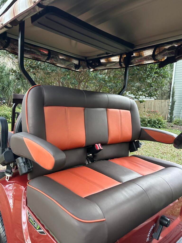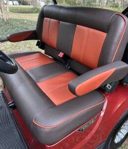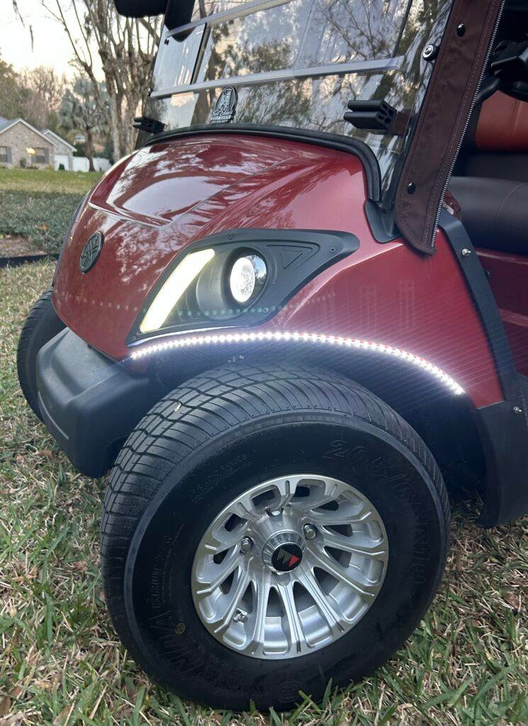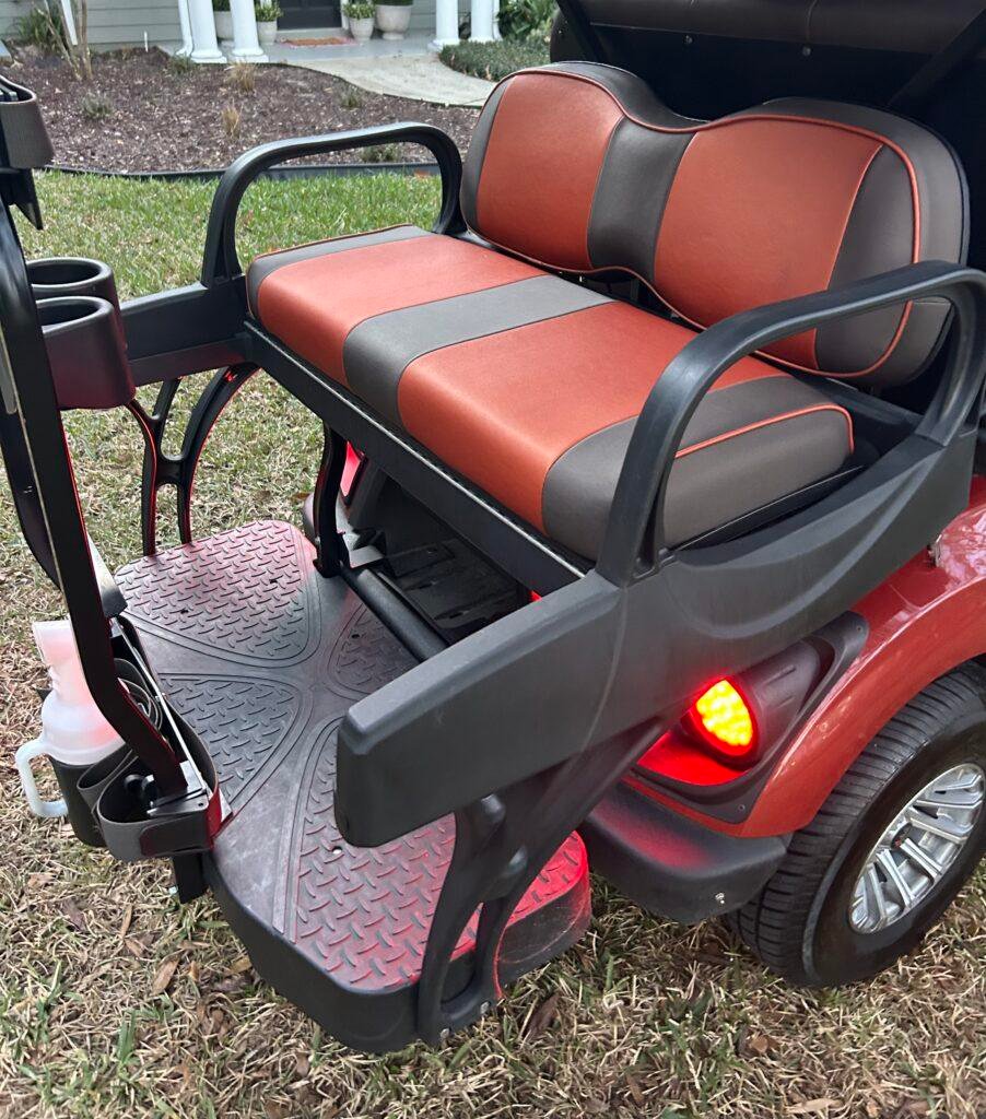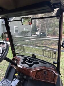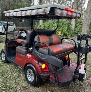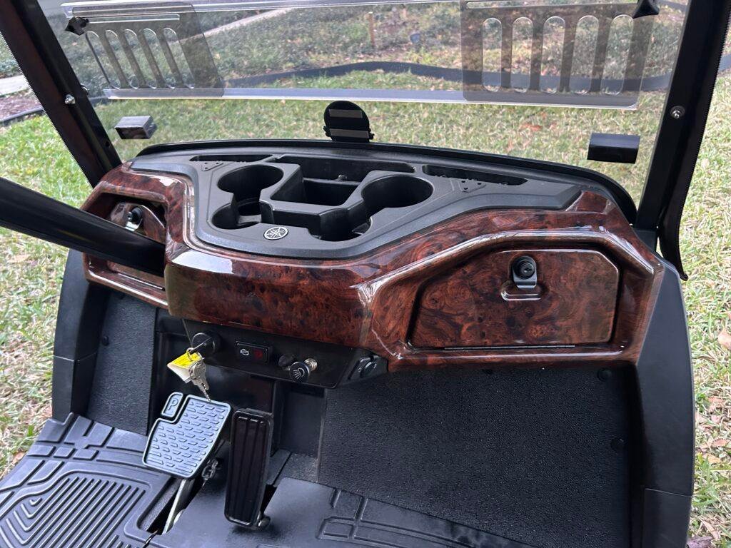 It comes with with full street ready LED light kit with with LED light strips in the front & SELF-CANCELLING turn signals! Has UPGRADED Backspin seating with arm rests in the front, with matching flip out back seat in rear (underneath storage), and the coveted EXTENDED ROOF to stay out of the Florida elements. Has seatbelts for all passengers. Comes equipped with custom WOODGRAIN dashboard with lock boxes, 12V outlet to charge phone, speedometer, 2 overhead trays, floor mat, gas gauge, sand bottle, full rain enclosure with EZ snaps, golf bag attachment, 3rd brake light, tires in great shape and vented windshield.