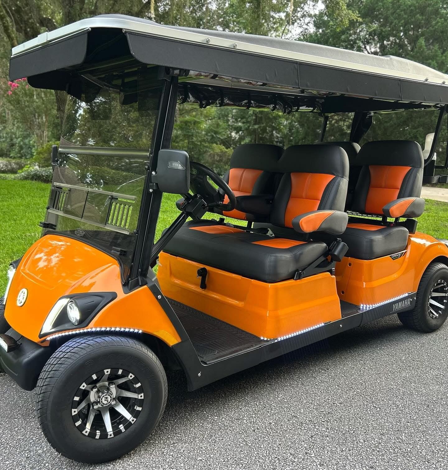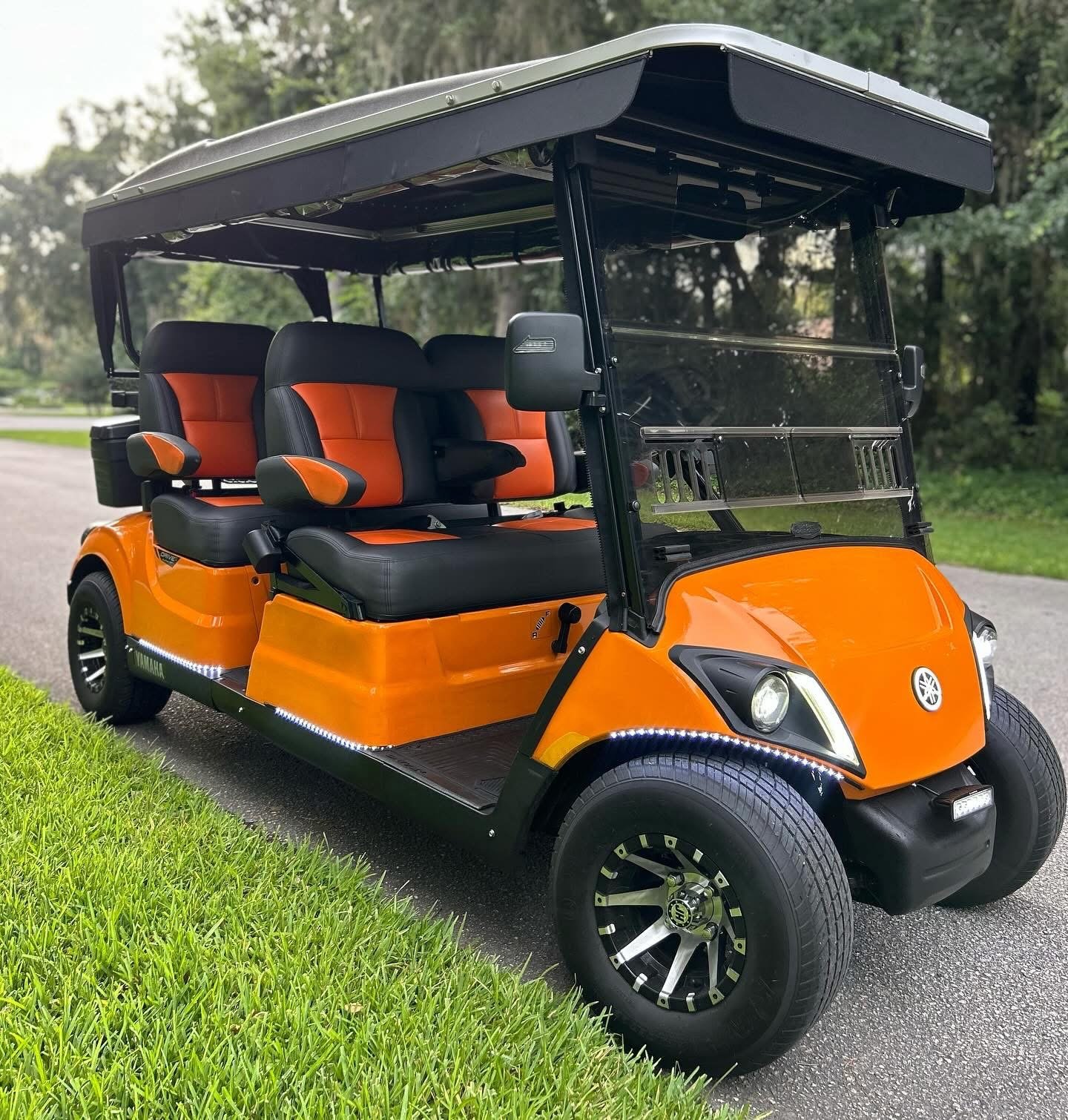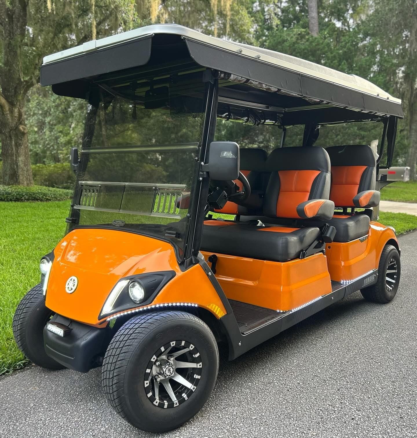 It is absolutely LOADED with full LED light kit, Yamaha illuminated logo, LED strips on front and all down the sides with SELF-CANCELLING turn signals. Has UPGRADED El Tigrè Elegantè seating with 3 arm rests and seatbelts in the front and the back, gas gauge/hour meter, speedometer, overhead tray, cooler, sand bottle, custom wheels, hard valence enclosure, painted roof with chasing 3rd brake light and more!