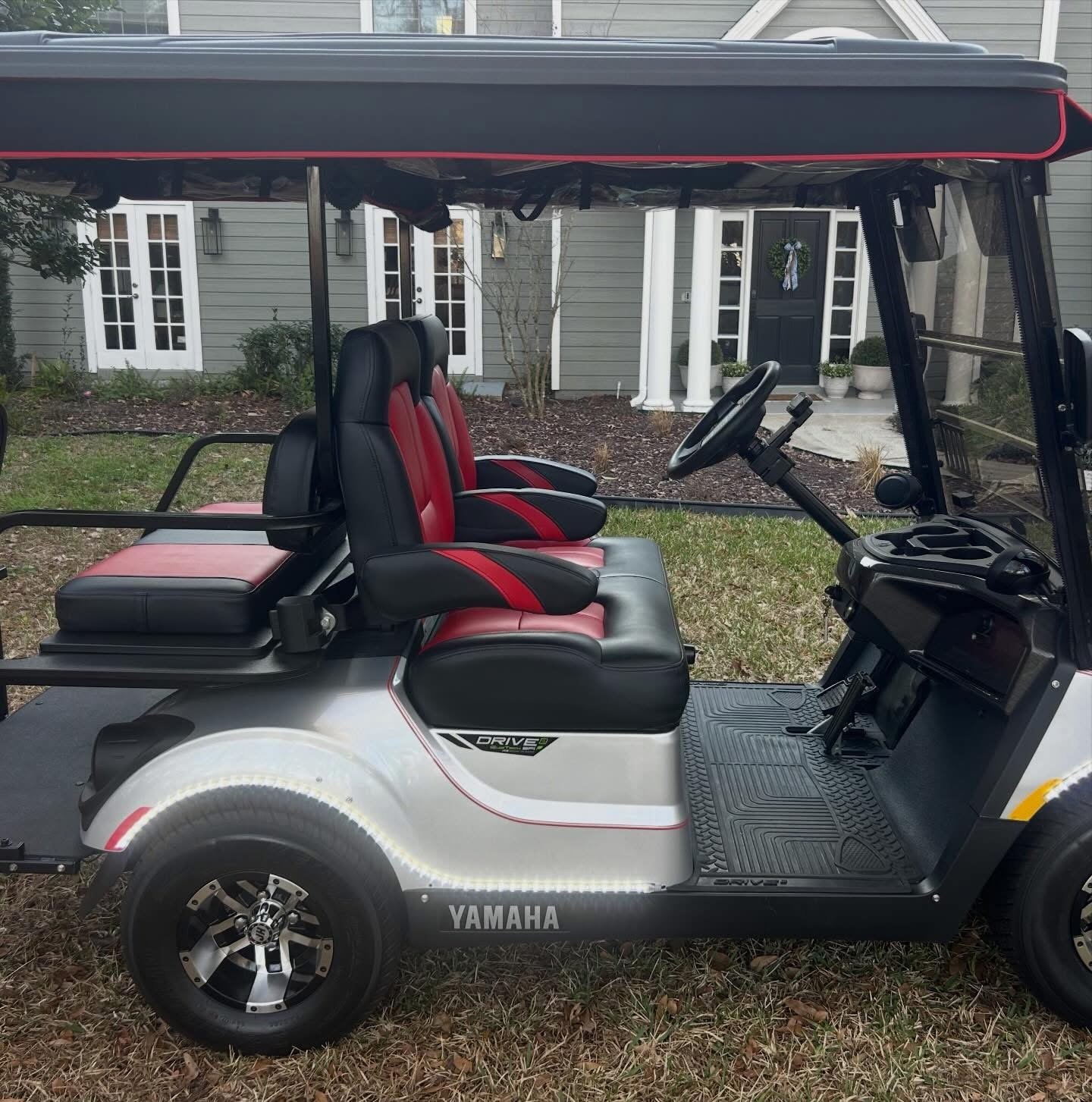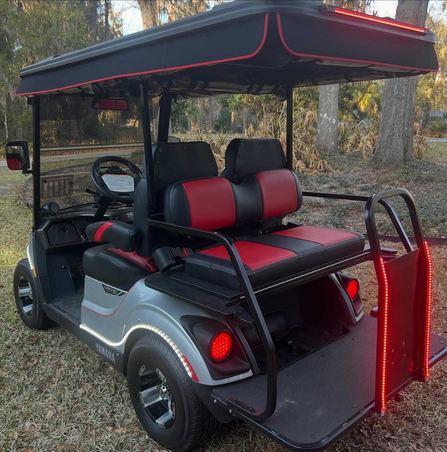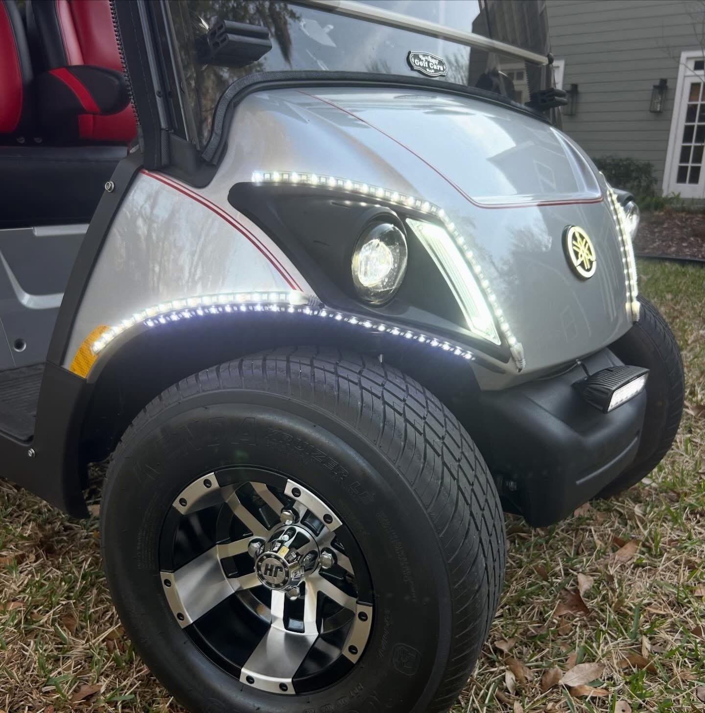 It’s LOADED with street ready LED light kit, with Yamaha illuminated logo, LED light strips on front, sides and rear with SELF-CANCELLING turn signals and additional LED light bar! Has beautiful El Tigrè seating with 3 arm rests in the front and matching custom seat in the back (w/seatbelts) that flips out to utility bed. Equipped w/custom locking dash, gas gauge/hour meter (125), speedometer, Backup camera, JBL Bluetooth speakers, overhead tray/sun visors, USB ports to charge phone, tinted windshield and more! Has extended roof with hard valence enclosure, custom wheels and tires & much, much more!