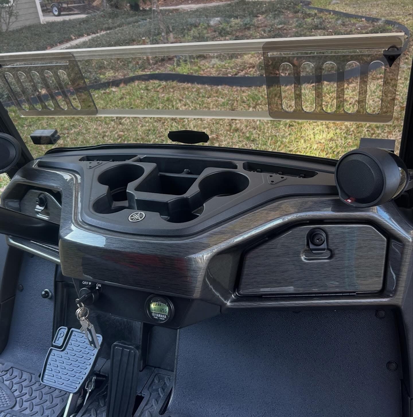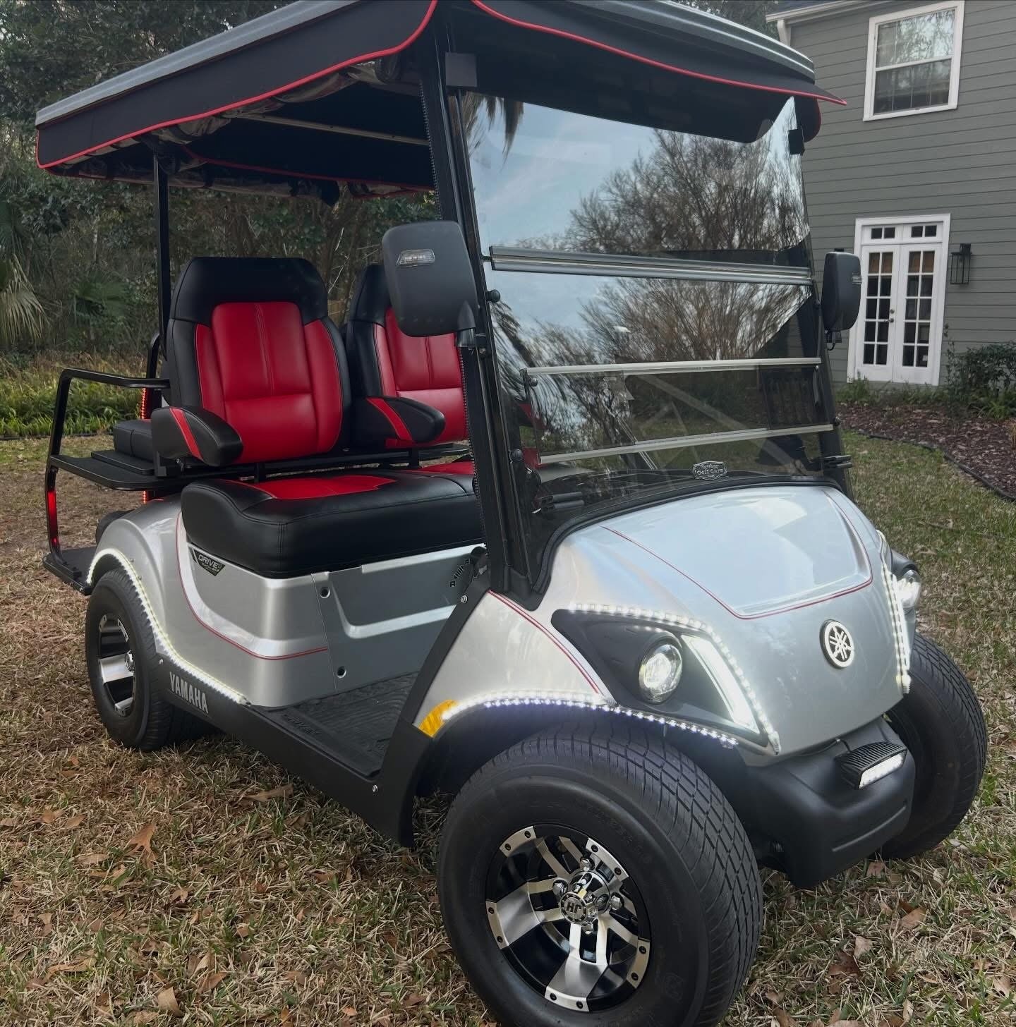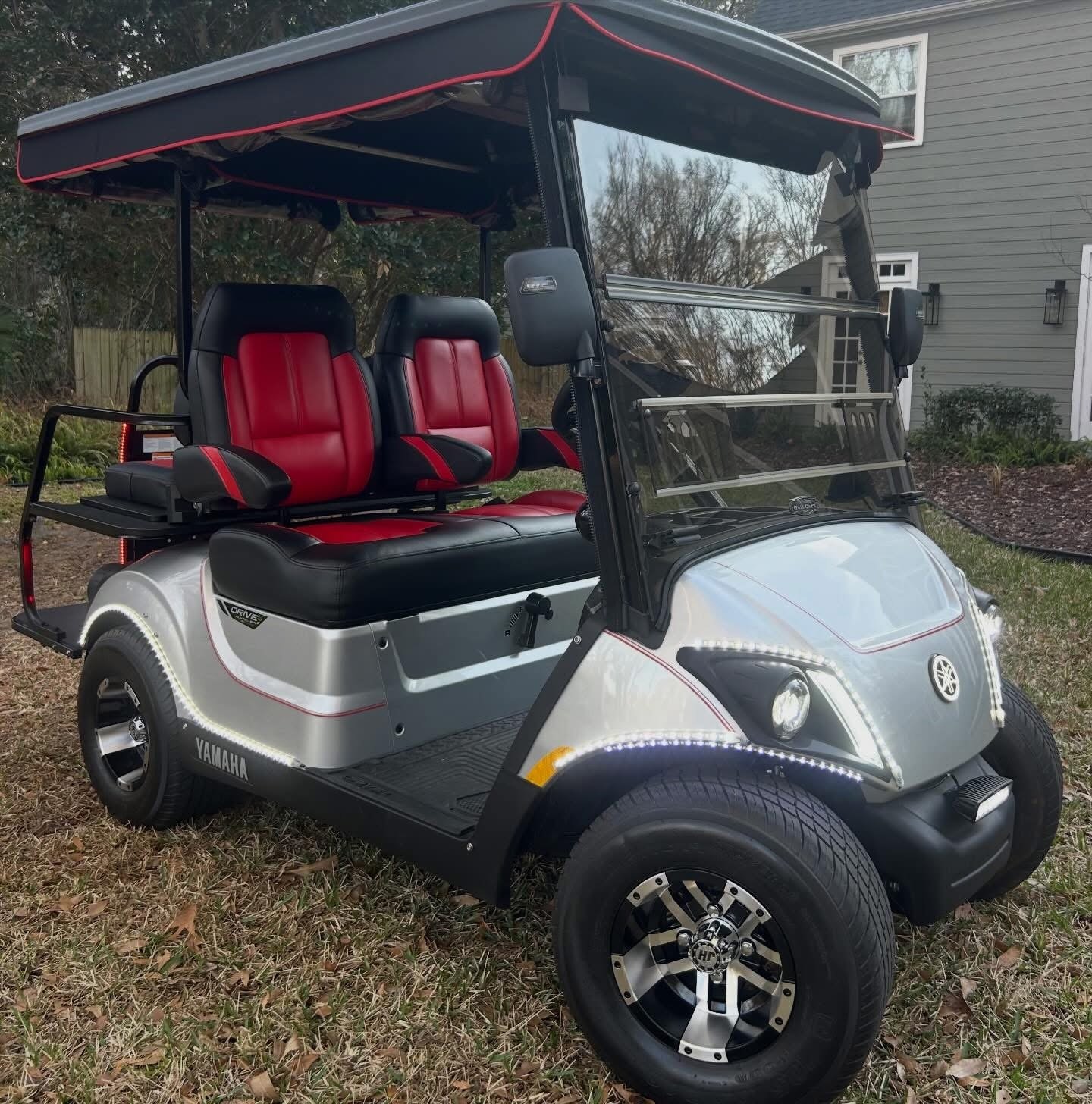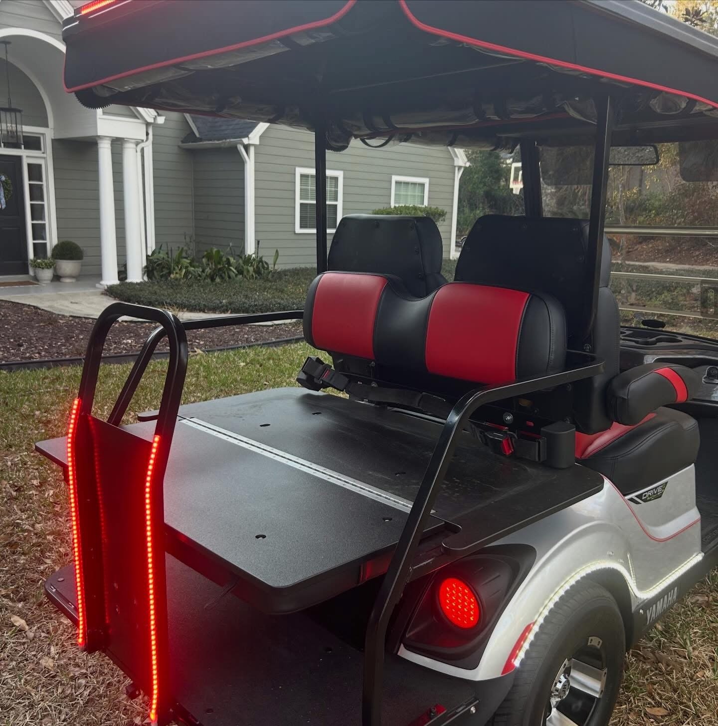 It’s LOADED with street ready LED light kit, with Yamaha illuminated logo, LED light strips on front, sides and rear with SELF-CANCELLING turn signals and additional LED light bar! Has beautiful El Tigrè seating with 3 arm rests in the front and matching custom seat in the back (w/seatbelts) that flips out to utility bed. Equipped w/custom locking dash, gas gauge/hour meter (125), speedometer, Backup camera, JBL Bluetooth speakers, overhead tray/sun visors, USB ports to charge phone, tinted windshield and more! Has extended roof with hard valence enclosure, custom wheels and tires & much, much more!